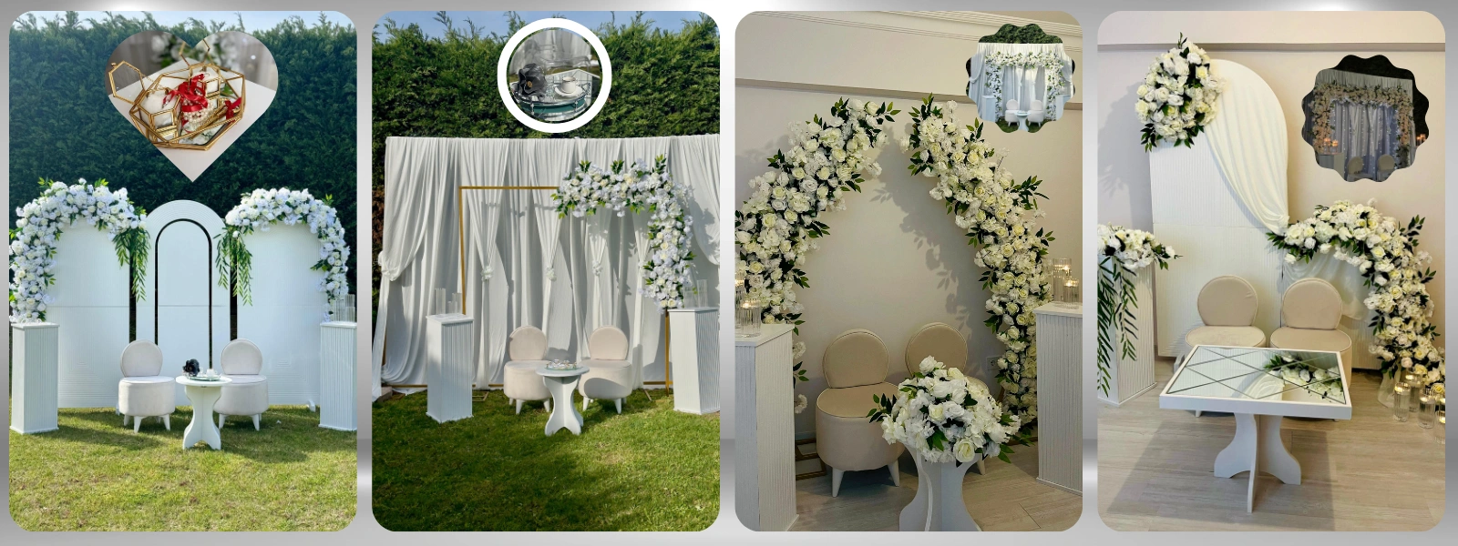 - Söz ve Nişan Masası: Göz alıcı söz ve nişan masası düzenlemeleriyle davetlilerinizi büyüleyecek detaylara imza atıyoruz. Özel tasarım arka panolar, zarif yüzük tepsisi ve temaya uygun süslemelerle fark yaratıyoruz.